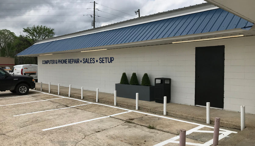 The prior business was a shabby, run down eyesore for many years. Carl called us after hiring an artist to paint a mural on the left side of the building. He needed our help to draw customers from the right side and to create a welcoming front entrance. We had fun designing an attractive exterior for his growing business on a busy road. Now, you can't help but know where to go for all of your phone and computer needs in Ascension Parish!