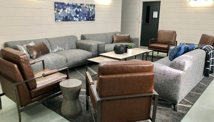 We decorated multiple offices and a few of the dorm buildings. There were five identical dorm buildings. Each building was divided in half (A + B), housing 15 men on each side. The bunk rooms surround one main hang out space on each side. These "living rooms" aren't what you would see in a personal residence. We had to get creative in order to seat all 15 men, should they be there at the same time. The goal was to create conversational seating and not seating for tv watching. Because both sides were mirror image, we created a space plan easily duplicated for each of the buildings. We then decorated Dorms 3 and 4 from scratch, Dorm 5 with second hand furniture and later Dorms 1 and 2 were decorated by The Church United staff.